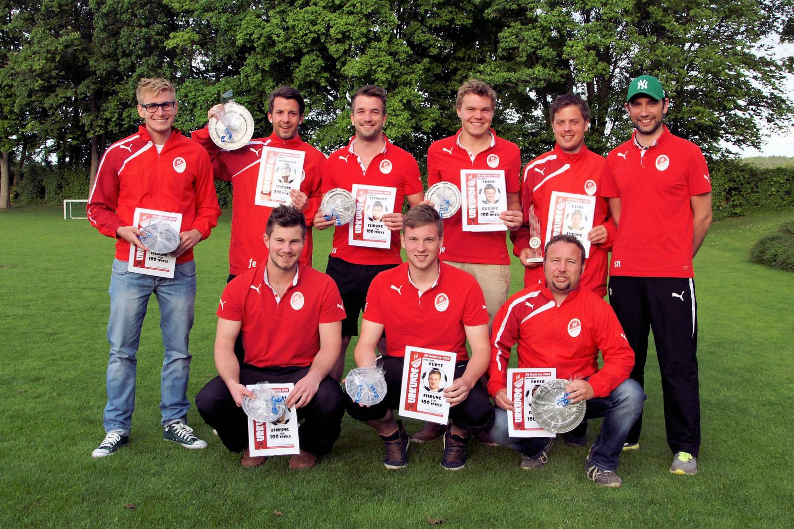Jörg Dippel wurde dabei für 400 Spiele für den SV Mehring ausgezeichnet. Er hat schon zu Kreisligazeiten zu den Stützen des SV Mehring gezählt. Andreas Unterhuber, der Regisseur und Spielgestalter lief 200 mal in den Farben des SV Mehring auf, ebenso wie Michael Dudek. Auf 100 Einsätze haben es Andreas Schmidt, Michael Erber, Johannes Erber, Stefan Schmölz und Sebastian Fürst bereits gebracht. Abteilungsleiter Johann Schmidhuber erhofft sich durch die spontan einberufene kleine Feier einen positiven Schub im Kader für die noch ausstehenden zwei Spiel in der Kreisklasse 3, um dort der Relegation zu entgehen.